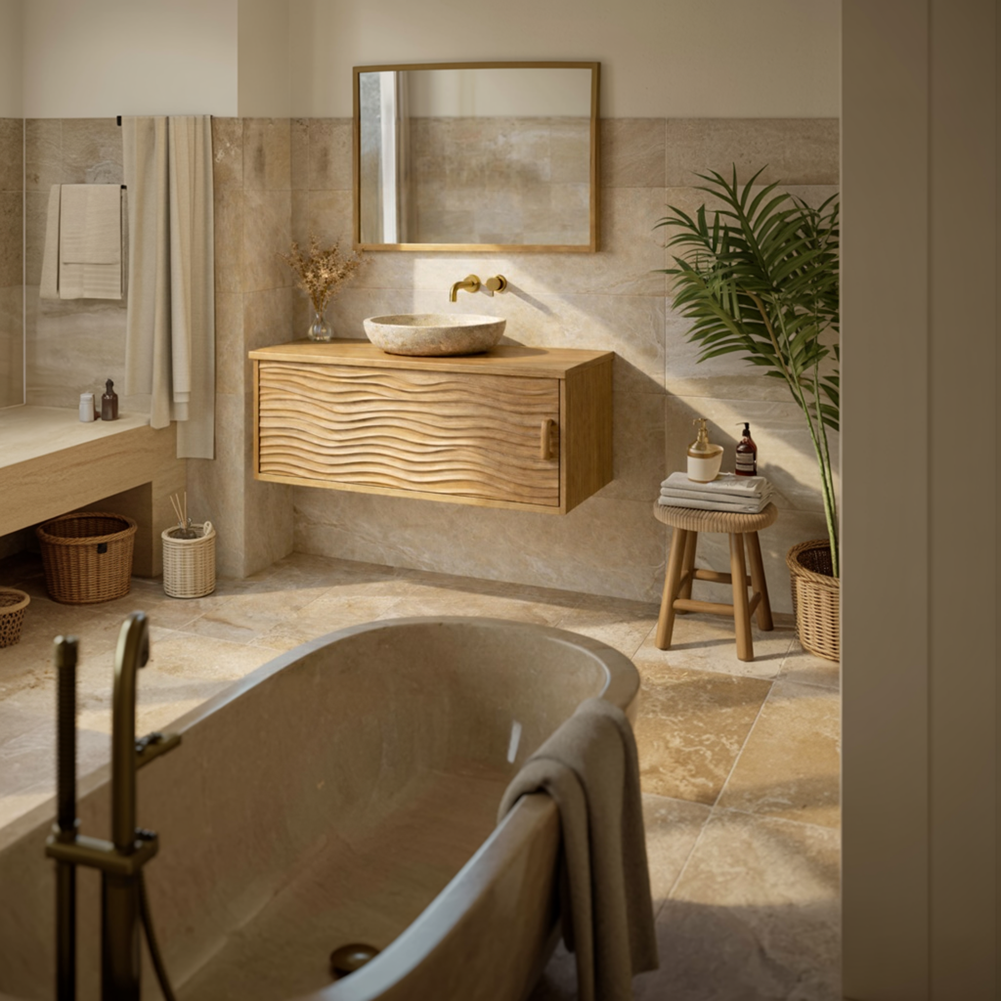 With softly sculpted edges and a straightforward structure, this vanity highlights a rustic, handcrafted aesthetic without excessive ornamentation. The natural wood surface becomes the primary design element, creating a calm and grounded atmosphere suitable for modern and minimalist bathrooms.